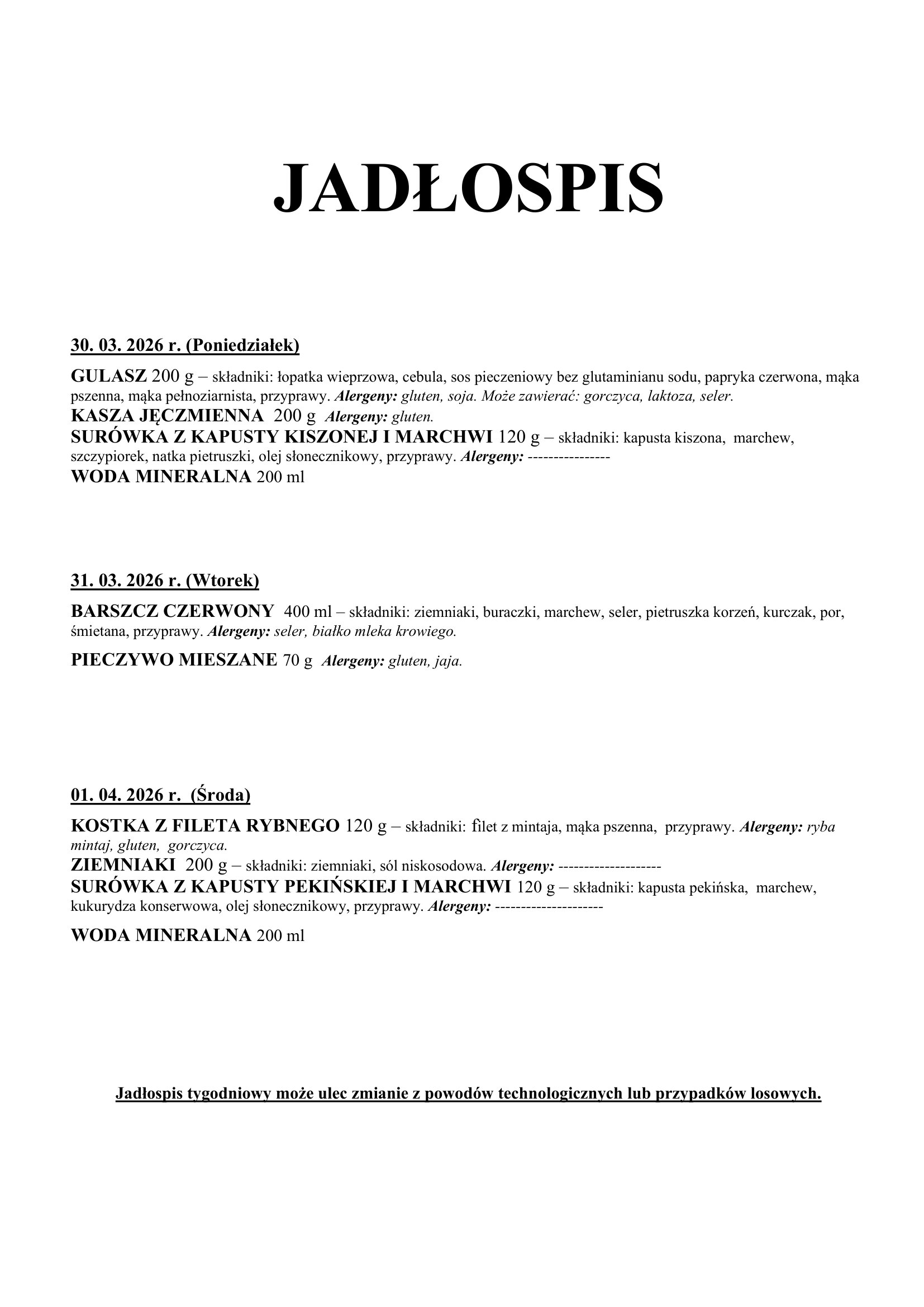 Jadłospis szkół od 30-03 do 1-04-2026 r.